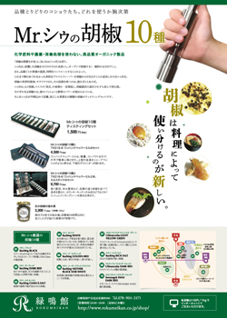 | 緑鳴館インターネットショップは ←こちらです! ハイクオリティなMr.シゥの胡椒と 彼のペッパーを使った世界にひとつだけのユニークな ギフト商品をご紹介しています。その他厳選したキッチンツールや オーガニックフーズもオススメがいろいろ........ |