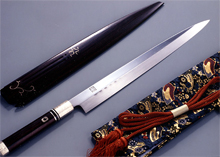 | 一振りずつ手仕事で鍛え上げています。 | 伝統と技術によって作られた品々は、美術品といえるほど見るものを魅了します | 総銀 特別鍛え柳刃総銀黒檀八角柄目釘付黒檀鞘 |